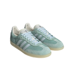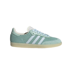 The Adidas Samba OG in Hazy Green and Sky Tint brings a fresh twist to the iconic silhouette, blending timeless design with modern colorways. Originally designed for indoor football, the Samba has evolved into a streetwear staple known for its low profile and classic styling. This version features a soft suede upper in a muted hazy green tone, contrasted with pastel sky tint accents on the iconic three stripes and heel tab. A reinforced toe, gum rubber outsole, and gold-foil "Samba" lettering maintain the heritage look, while offering everyday comfort and grip. Whether you're pairing it with casual fits or dressing down more polished looks, this updated Samba OG adds a subtle pop of color to your rotation without straying from its vintage roots.