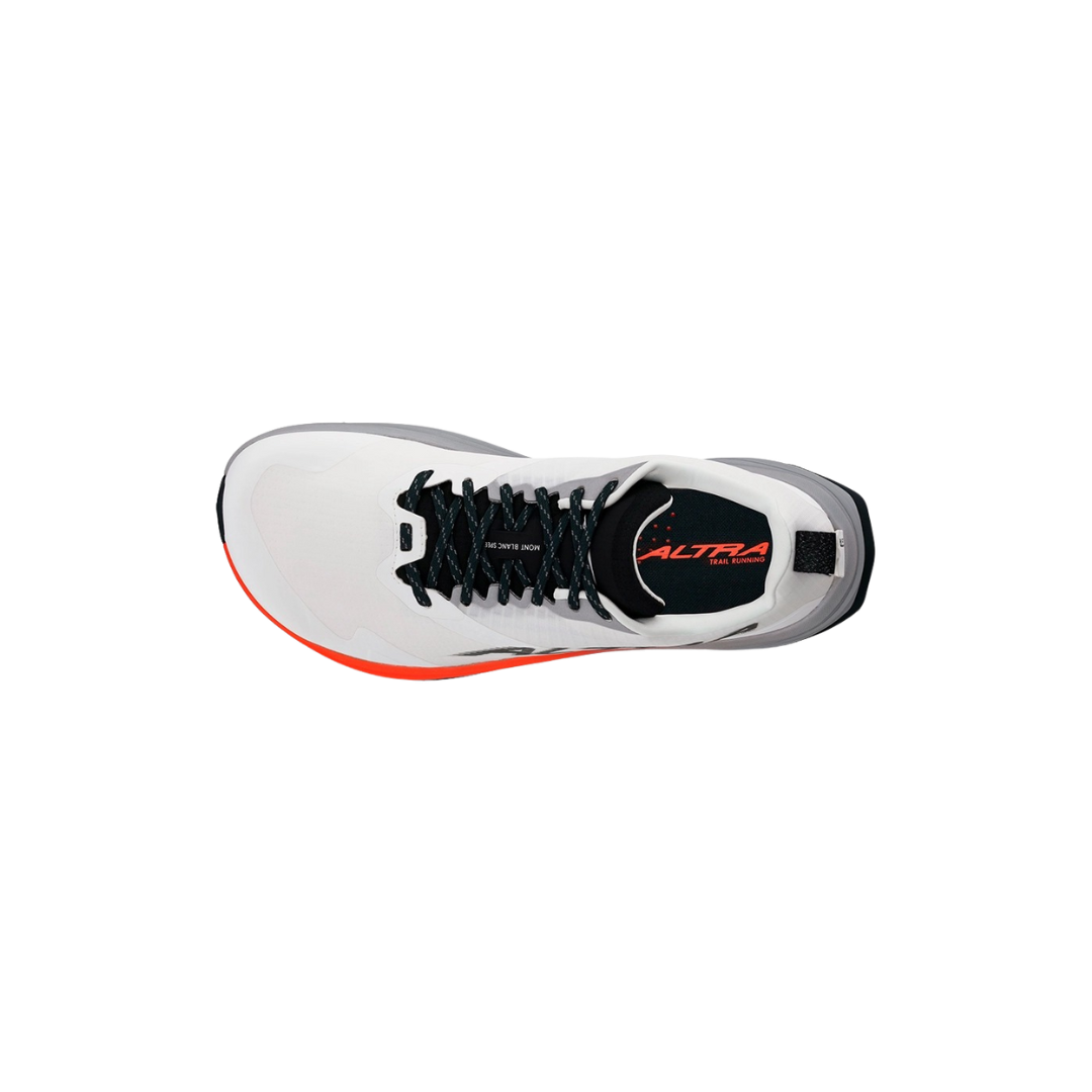 The Altra Mont Blanc Carbon M in White/Coral is a high-performance trail running shoe designed for ultra-distance races on technical terrains. Featuring a full-length Carbitex™ Monoflex carbon plate, it offers enhanced propulsion and stability without compromising flexibility. The dual-density midsole combines Altra EGO™ MAX foam in the rim for cushioning and Altra EGO™ PRO foam in the core for responsiveness. Its Vibram® Megagrip outsole with Litebase technology ensures exceptional grip on both wet and dry surfaces, while the 0mm drop and spacious toe box promote a natural stride. Weighing approximately 10.9 oz (309 g), it's suitable for runners seeking speed and comfort on challenging trails.