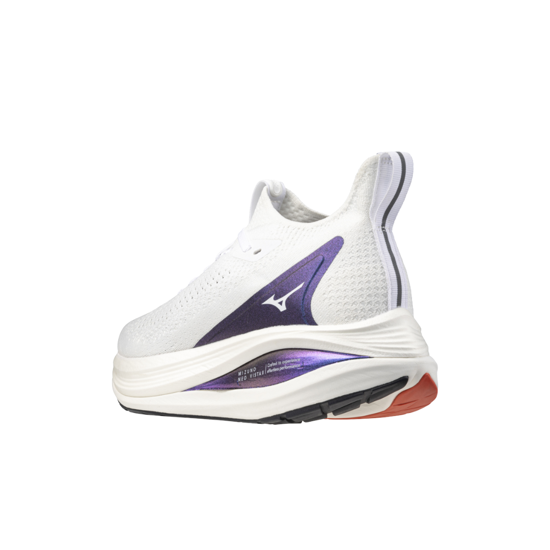 The Mizuno Neo Vista 2 M in White/White/Iris Bloom is a high-performance super trainer designed for runners seeking a balance between cushioning and responsiveness. It features Mizuno's ENERZY NXT technology, with a nitrogen-infused top midsole layer for soft, responsive cushioning and impressive energy return, while the EVA-based ENERZY NXT in the bottom midsole delivers enhanced stability.