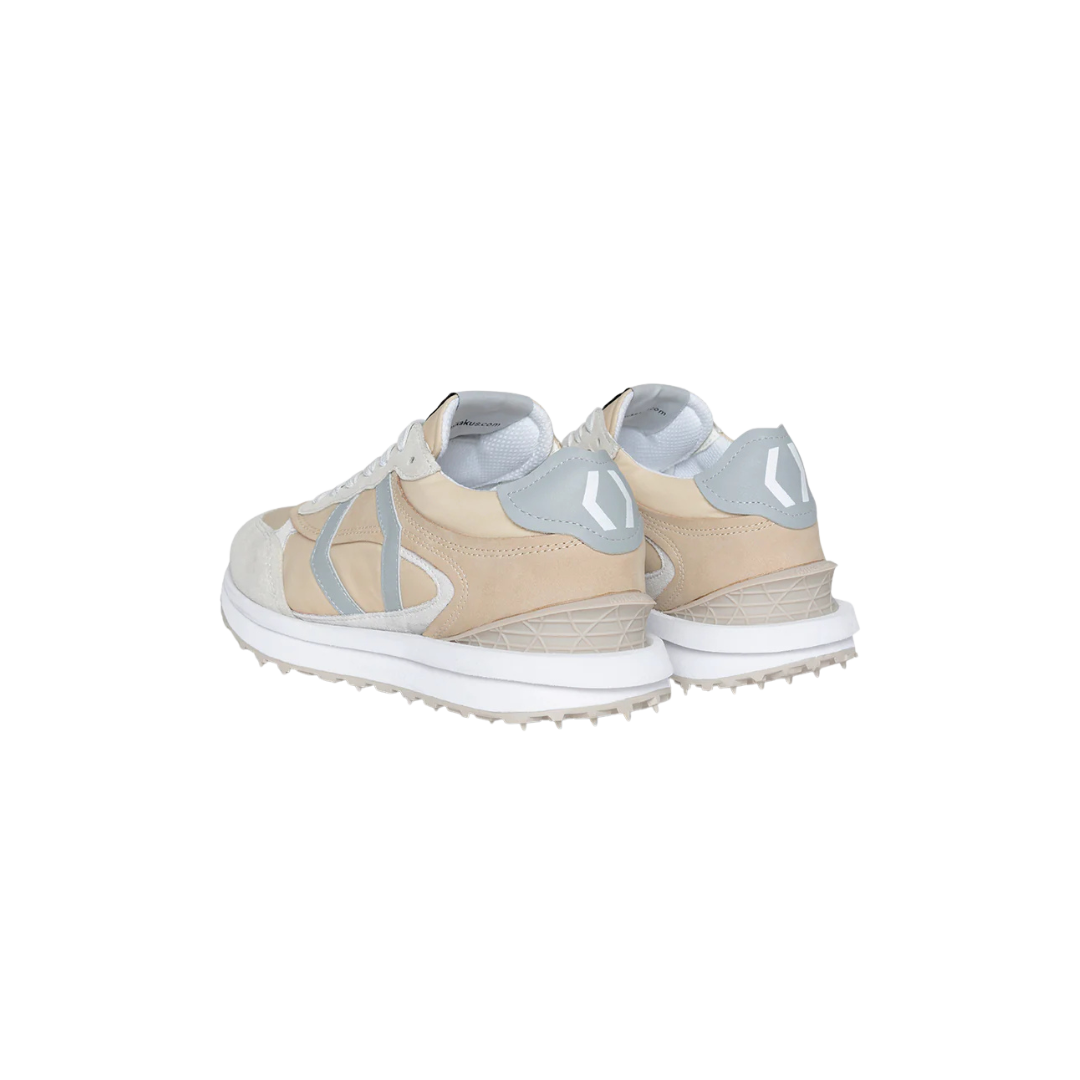 The 018 Studio blends fabric, beige suede, and nubuck leather with refined grey leather accents for a modern, sophisticated aesthetic. A white mesh lining offers breathable comfort, while two lace options—white and yellow—let you personalize the look to suit any outfit.