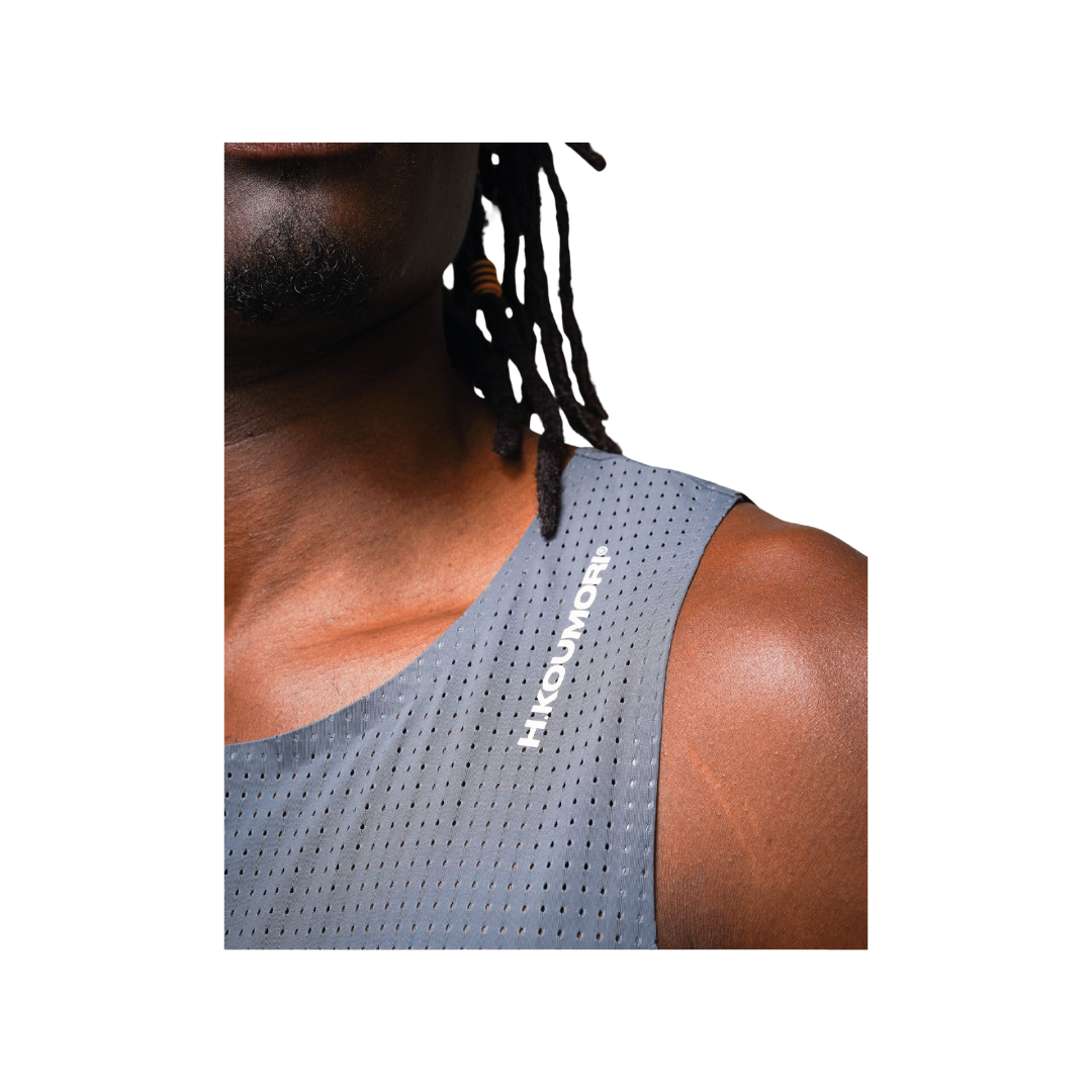 The Hermanos Koumori Training Singlet in Turbulence Blue is crafted from a lightweight, high-performance blend that delivers stretch, breathability, and quick-drying comfort. Designed with an all-over perforated fabric for enhanced ventilation, a round neckline, and deep-cut armholes for unrestricted movement, it features a regular fit and is finished with clean heat-transfer detailing for a refined technical look.
