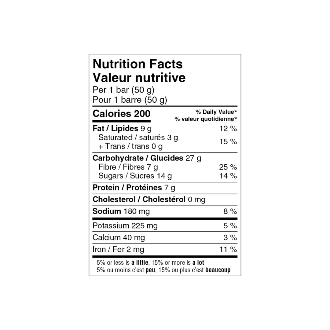 Sugars (date paste, brown rice syrup), peanut butter, peanut flour, protein blend (pea protein isolate, soy protein isolate, almond protein), chocolate chips (organic cane sugar, unsweetened chocolate, cocoa butter), chicory root fiber, cocoa butter, organic crisp rice (organic rice flour, organic evaporated cane juice, salt), flavours, roasted peanuts, arabic gum, rolled oats, sunflower seeds, sea salt, citrus fiber, mixed tocopherols (antioxidant).