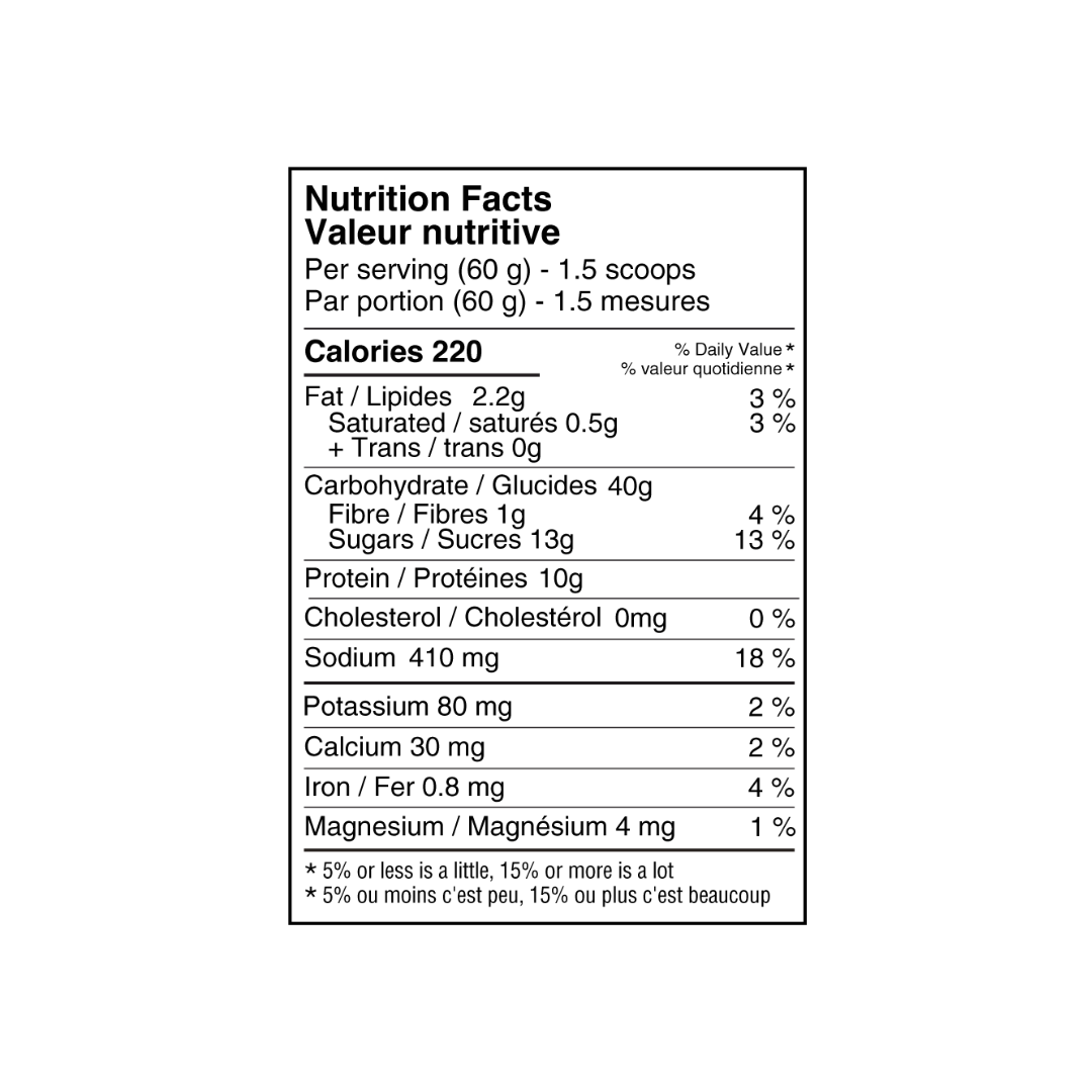 Sugars (dehydrated rice extract, cane sugar), hydrolyzed oat flour (gluten-free), pea protein isolate, canola protein isolate, sea salt, natural flavours.