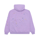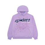 Dressed in light purple, this Sp5der Acai Hoodie is made of high-quality cotton. The front features several branding details, including black "Sp5der!" lettering with tiny gems on the outline and smaller white "here’s the slime" type under it, as well as a spider web design in contrasting purple that dominates the front and tiny, multicolored stars. The tiny stars also appear on the back. Other details include a kangaroo pouch pocket, a hood without a drawstring pull, and ribbed hem and cuffs.