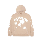 Crafted from premium cotton, this hoodie features a warm sand-colored base, elevated by bold graphic elements and a forward-thinking aesthetic. The front displays the signature “Sp5der” branding in stylized lettering, embellished with sparkling rhinestones that add texture and shine. Surrounding the logo are distressed graphics and spray-painted effects, enhancing its raw, urban edge. A spider web graphic subtly stretches across the chest, perfectly in line with the rebellious theme that defines the brand.