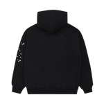 This iteration of the Sp5der OG Web Hoodie comes in a black colorway. The front of the sweatshirt features the Sp5der brand name arching across the chest in bold white text. Taking up the rest of the front of the sweatshirt beneath the brand name is an intricate white spider web design outlined with small white stars. The Sp5der brand name can be seen carefully woven into the spider web near the bottom by the kangaroo pocket. The left sleeve is also peppered with small white stars, while the back of the sweatshirt is solid black.
