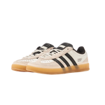 The Adidas Gazelle Indoor Bad Bunny is a stylish addition to the Gazelle line, featuring a color combination of off-white, black, and caramel. The collaboration with Bad Bunny adds a modern touch to this classic silhouette. The upper is off-white with black details and a caramel-colored sole. The heel includes a label with the size and the text "Benito" below the Adidas logo, paying tribute to Bad Bunny. Made with high-quality materials, these sneakers are a standout piece in any collection.
