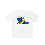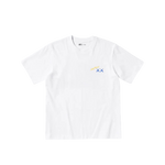 The KAWS + WARHOL UT Tee in white features a striking and creative design that fuses the distinct styles of KAWS and Andy Warhol. The front of the tee showcases Warhol's iconic banana graphic, famously associated with The Velvet Underground, reimagined with KAWS' signature touches, including the playful "X" eyes. Set against a crisp white background, the design pops, making it a standout piece. Crafted from premium, soft cotton, this tee offers both comfort and style, perfect for fans of contemporary art and streetwear culture.